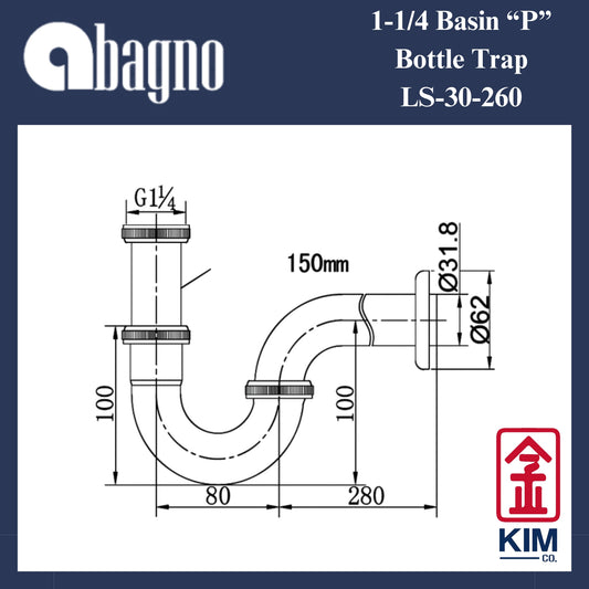 Abagno Stainless Steel Basin "P" Bottle Trap (LS-30-260)