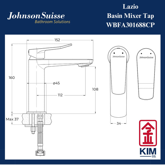 Johnson Suisse Lazio Basin Mixer Without Pop Up Waste (WBFA301688CP)