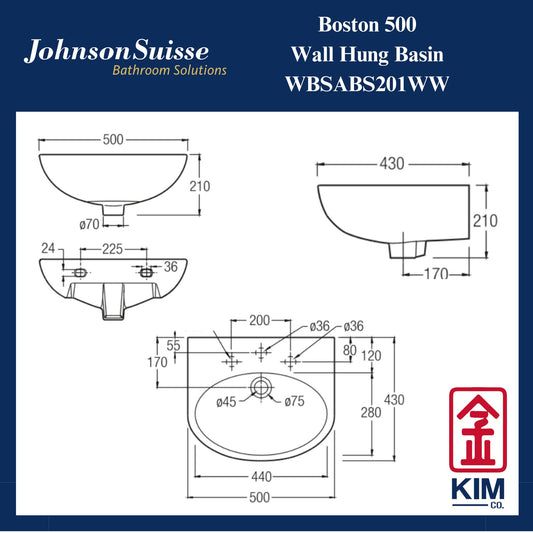 Johnson Suisse Boston 500 Wall Hung Basin (WBSABS201WW)