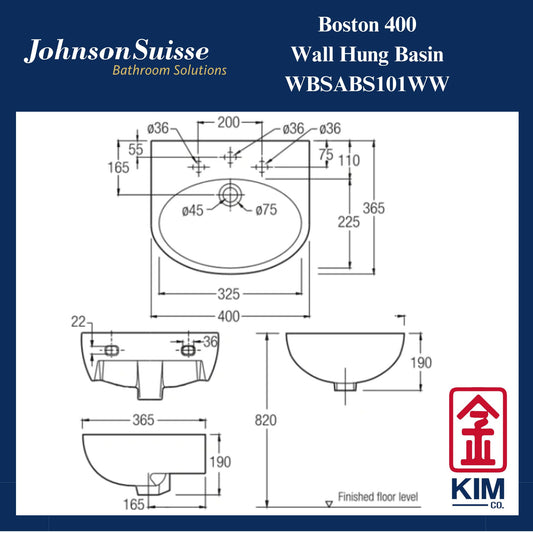 Johnson Suisse Boston 400 Wall Hung Basin (WBSABS101WW)